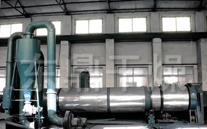 主要由熱源、上料機、烘干滾筒、傳動裝置、下料機、引風機和配電柜構成,濕啤酒糟送入烘干滾筒,筒體內設有多個排列為螺旋形的抄板,通過筒體的旋轉帶動抄板將酒糟不停的揚起,筒壁的擊打裝置防止物料粘結筒壁及抄板,揚起的物料與由引風系統傳入的熱氣流充分接觸,加快了烘干傳熱、傳質,蒸發水分,完成干燥,由出料口排出。
